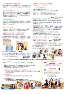 おやこ遊び、育児相談、一時預かり(短時間保育)などができます。 また、読み聞かせの会などイベントも開催します。